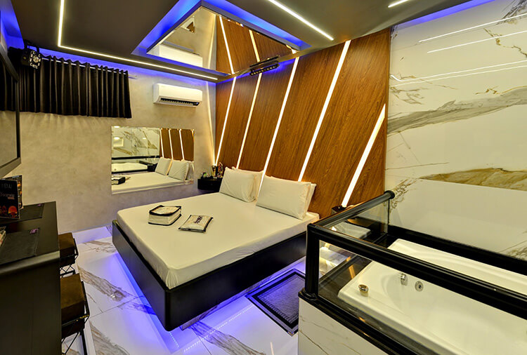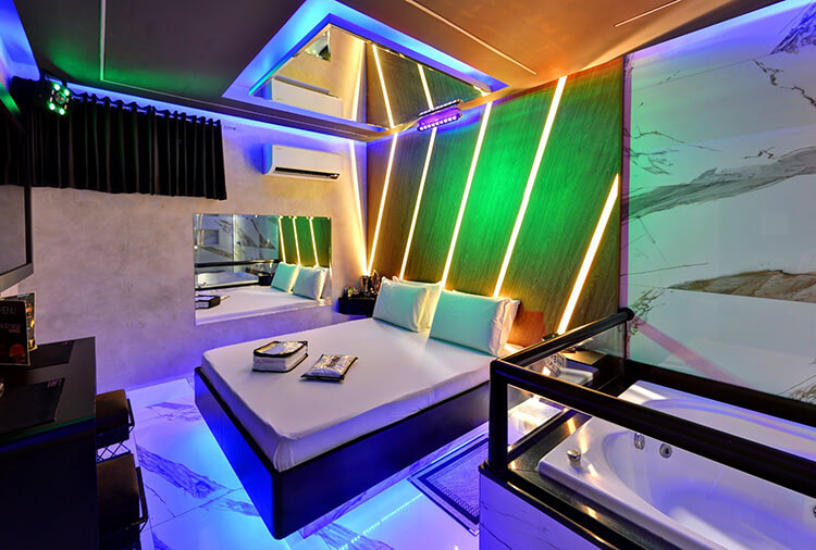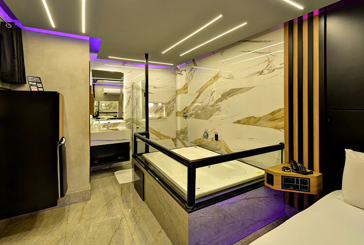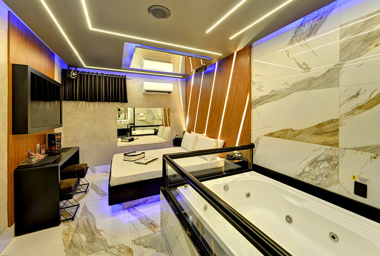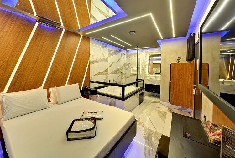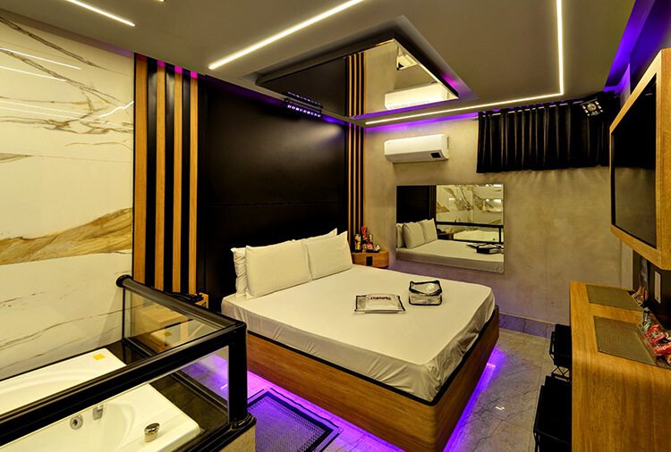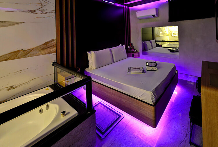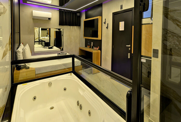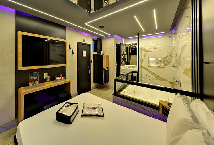 6 canais eróticos, ar-condicionado split, CD player, chapinha de cabelo, ducha, frigobar, garagem privativa, hidro dupla, saleta para refeições, secador de cabelo, som ambiente, TV 32" LCD, TV a cabo, WI-FI
